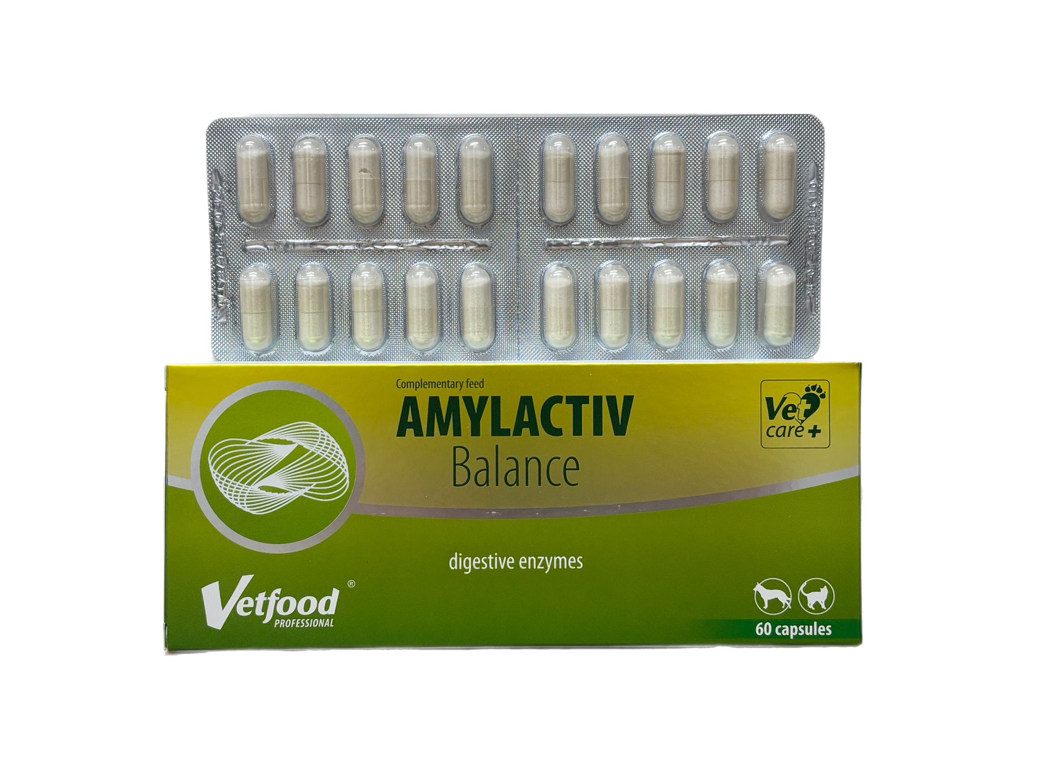 Blistry pochodzą z oryginalnego opakowania Vetfood Amylactiv Balance 60 kapsułek.